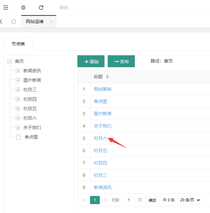 点击网站运维,列出所有本站点,已创建的栏目,点击指定栏目的名称,进该栏目的前台页面