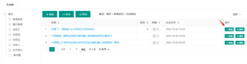 首页 > 第二章 功能应用说明 > 2.5 文章管理 > 2.5.3 修改文章 2.5.3 修改文章 1、修改文章中的信息。 管理员登录,进入指定站点的管理后台,打开网站运维菜单 定位到需要修改文章的栏目,点击指定文章后面的编辑按钮,即可对文章进行修改