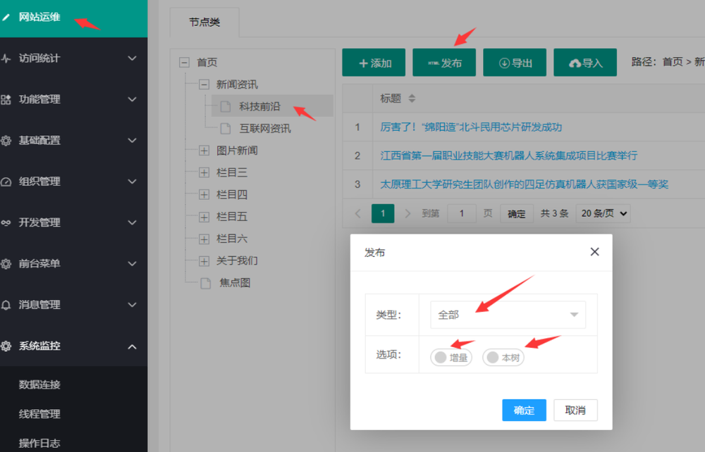 管理员登录系统后,进入到默认站点管理后台,定位到网站运维菜单,选择指定文章栏目后点击发布按钮
