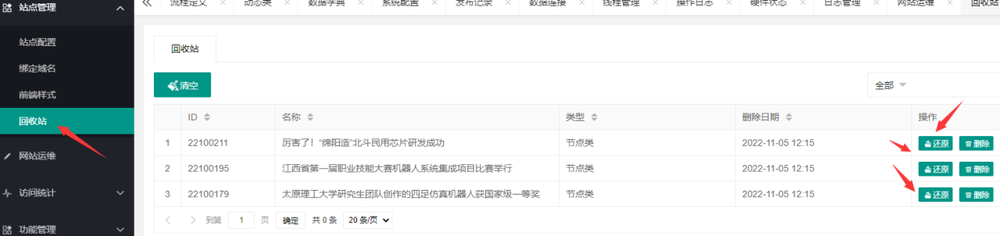 管理员登录系统后,进入到默认站点管理后台,定位到站点管理下面的回收站菜单,回收站中列出所有类型的已删除内容,可按类型、名称、ID、删除日期进行筛选,找到指定文章后点击后面的还原按钮,可将文章还原。