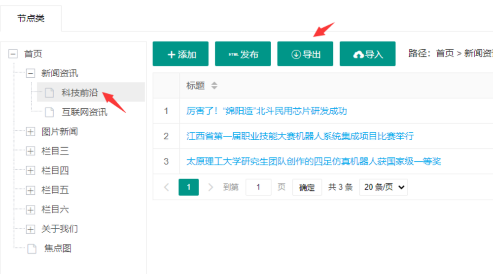 管理员登录系统后,进入到默认站点管理后台,定位到网站运维菜单,然后点击指定文章类根节点(这里判断如果是导出文件夹类节点,则只导出结构节点即文件夹及类别,如果在指定类别,比如新闻资讯类别节点上导出,则导出其下所有文章内容),点击导出,可将当前类别节点的所有文章。
