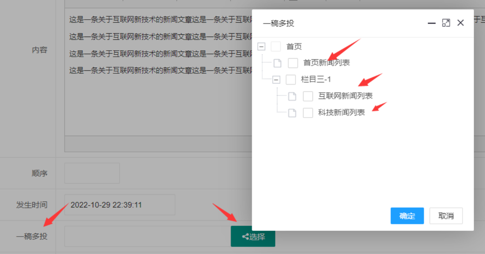 登录管理后台,定位到菜单网站运维,编辑指定文章,点击文章内容下方的一稿多投,选择要把该文章投到(引用到)何处(创建有半自动列举的栏目中),勾选后,确定,则该文章就会被引用到相应位置。