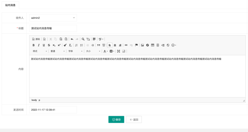 选择信息接收人,填写标题内容,选择发送人,系统自动填入发送时间,点击保存,即完成信息发送。