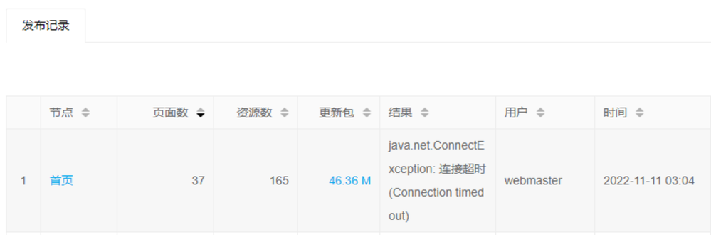 包括:统计的节点、页面数量、资源数量(指图片视频附件)、更新包的大小、当时更新的结果(有异常也会记录并显示),更新的用户,更新的时间。
