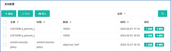 管理员可在“系统配置”中维护主键及数值,状态的管理信息。可直接导入json文件;勾选多条数据后,可将结果导出为json文件。可根据条件及关键词查询数据。